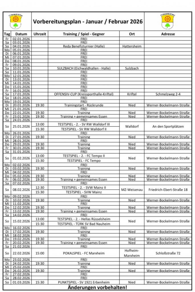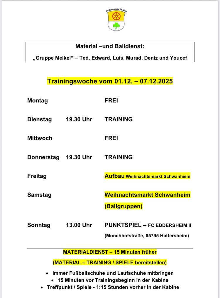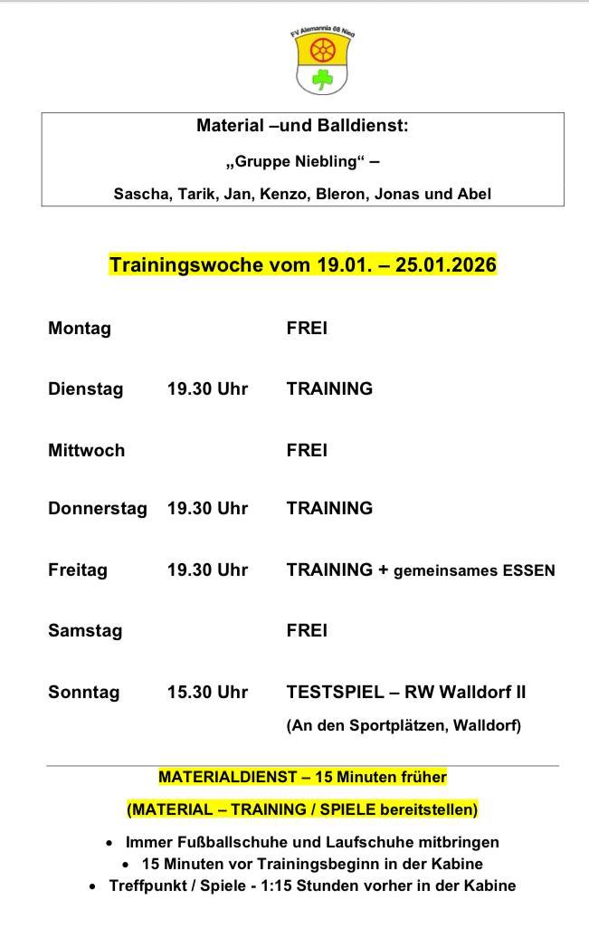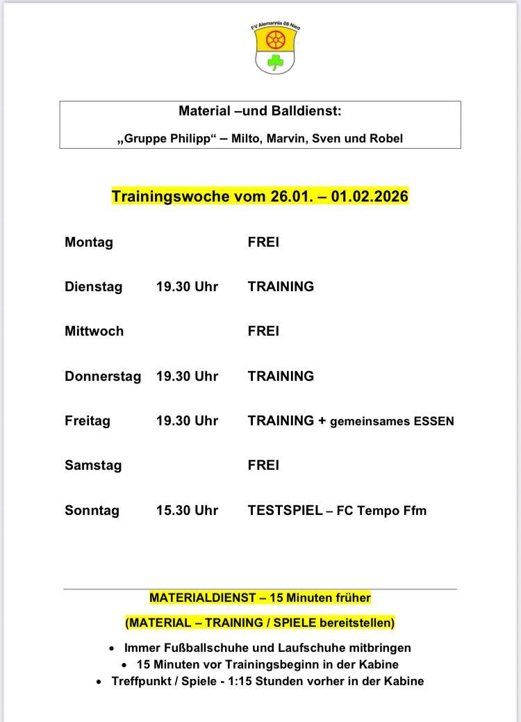 Trainingszeiten und Spielplan der 1. Mannschaft